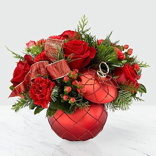 You can decorate your halls and holiday homes with our Christmas magic bouquets. This stunning bouquet allows you to share wonderful greetings of the season. It is an elegant combination of red carnations, bright red roses with nestled in a bed of Christmas greens. This arrangement gives a magical touch to the bouquet. All of these things are gathered with an ornament vase with stem lid to make our bouquet bright. It features a bold red ribbon with it. This flower arrangement captures the pleasure of holiday magic for whoever receives it.