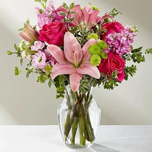- This bouquet comes with a clear glass vase.
